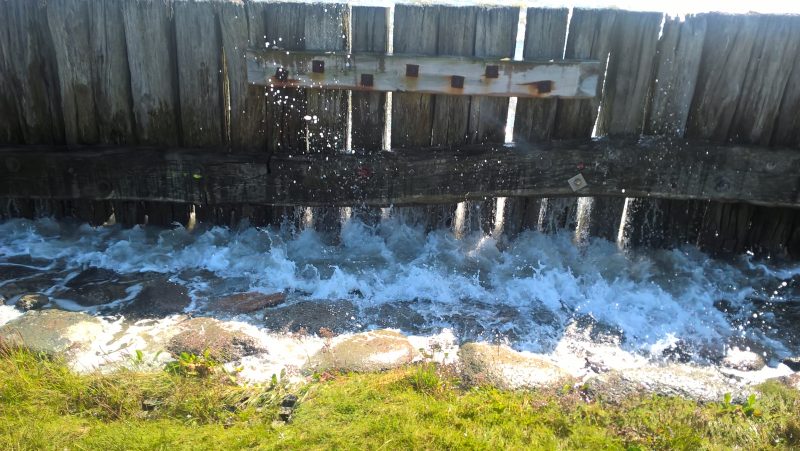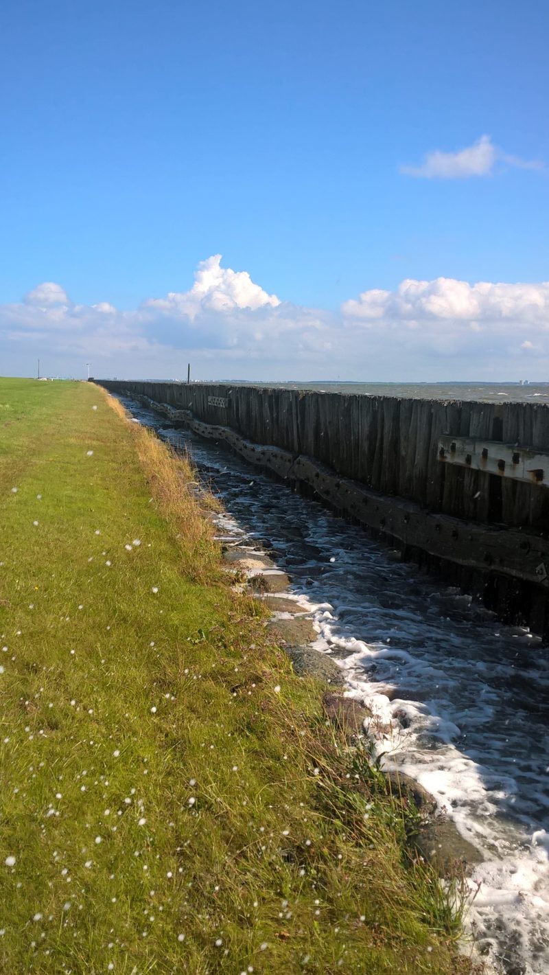Wieder an der Südseite angekommen erwartet mich ein beeindruckender Anblick. Die Flut ist da. Starke Windböen aus südlicher Richtung peitschen sie auf, schmettern sie gegen das Palisadengeschützte Ufer. Laut donnernd hauen die Wellen gegen Stein und Holz, Gischt fliegt durch die Ritzen des Holzes und oben rüber. Teils erst mehrere Meter hinter dem Holz Wall fallen die Tropfen zu Boden. Beeindruckend. Fasziniert beobachte ich dieses Schauspiel der Naturgewalten. Gut das ich da nicht draußen bin. Es sieht ausgesprochen ungemütlich aus.